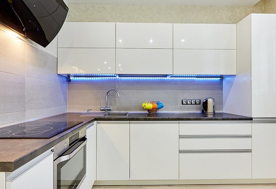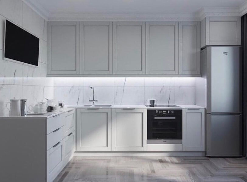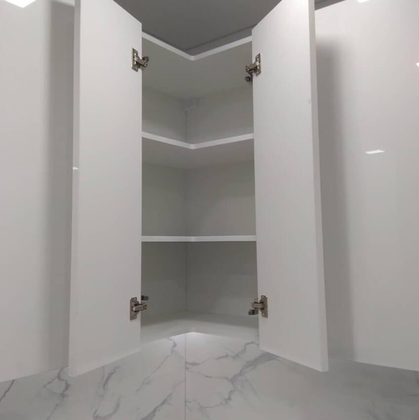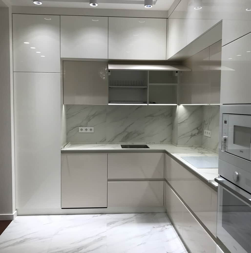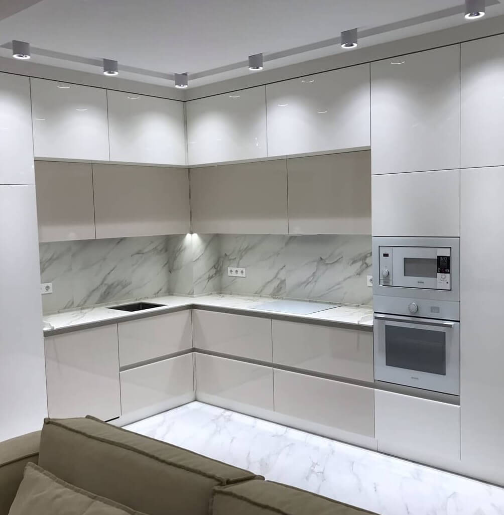Увидела на сайте и влюбилась. Нужна была П-образная белоснежная кухня супруг, когда увидел даже не стал сопротивляться. У нас чуть не стандартный размер комнаты был, под индивидуальные размеры изготовили. После установки не могла глаз отвести, ослепляет. Остались очень довольны. Думала, что будет сложно за ней ухаживать, все таки белая, но нет, протираю и следов не остается.
