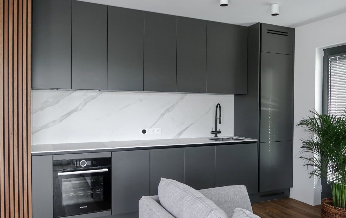 Идеальное сочетание лаконичных форм, глубокого матового серого цвета и темной рабочей зоны в кухне “Фолади”. Восхищена результатом! Кухня выполнена под заказ по индивидуальным размерам специально для просторной квартиры с открытым пространством. Отдельная благодарность за доставку без проблем и быструю сборку. Даже от дел отвлекаться особо не пришлось, так удачно все дела с кухней списались в график.